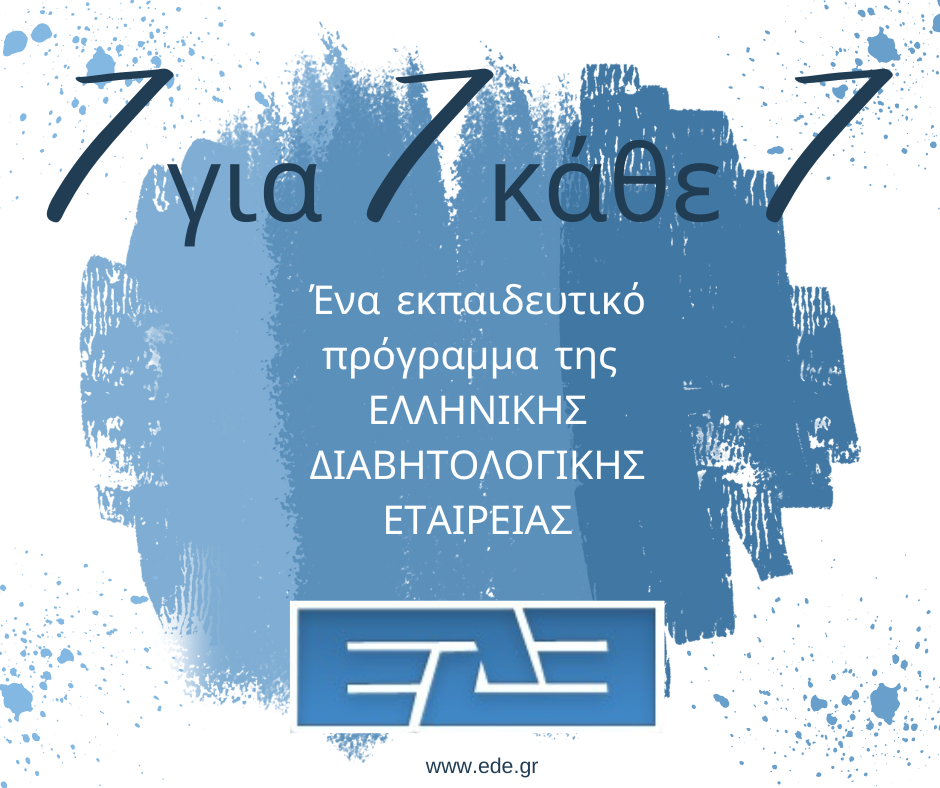 Με ιδιαίτερο ενθουσιασμό σας παρουσιάζουμε το Εκπαιδευτικό Πρόγραμμα «7 για 7 κάθε 7». Σε αυτό θα έχετε τη δυνατότητα να παρακολουθήσετε εκπαιδευτικά βίντεο που απευθύνονται τόσο σε ιατρούς όσο και στο ευρύ κοινό, με θέμα τον σακχαρώδη διαβήτη τύπου 2 (ΣΔτ2) και τις καρδιαγγειακές συννοσηρότητες. Πρόκειται για εμπεριστατωμένες ολιγόλεπτες διαλέξεις ειδικών, επιλεγμένων από το Διοικητικό Συμβούλιο της ΕΔΕ, επτά (7) στο σύνολό τους, με διάρκεια επτά (7) λεπτών το μέγιστο και συχνότητα προβολής ένα την εβδομάδα, για διάστημα επτά (7) εβδομάδων.