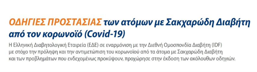 Η Ελληνική Διαβητολογική Εταιρεία (ΕΔΕ) σε εναρμόνιση με τις οδηγίες της Διεθνούς Ομοσπονδίας για το Διαβήτη (IDF) και με στόχο την πρόληψη και την αντιμετώπιση του κορωνοϊού (Covid-19) στα άτομα με Σακχαρώδη Διαβήτη και των προβλημάτων που ενδεχομένως προκύψουν, έχει ήδη από καιρού προχωρήσει στην έκδοση των σχετικών οδηγιών: