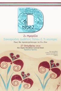 Mε ιδιαίτερη χαρά σας προσκαλούμε στη 2η Ημερίδα με θέμα: “Σακχαρώδης διαβήτης τύπου 2.Τι νεώτερο; Πως θα προσεγγίσουμε το ΕΥ ΖΗΝ”, που διοργανώνεται από την Ασκληπιός Πρόληψις ΜΚΟ σε συνεργασία με το διαγνωστικό κέντρο «Ασκληπιός Διάγνωσις» και θα πραγματοποιηθεί το Σάββατο, 27 Οκτωβρίου 2018 ώρα 16:30 – 21:00 µ.µ., στο ξενοδοχείο ΙBIS STYLES CENTRAL HOTEL στο Ηράκλειο Κρήτης.