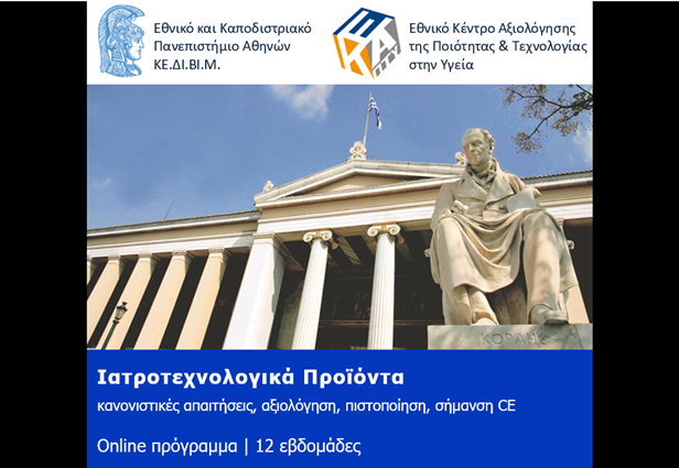 Tο Εθνικό και Καποδιστριακό Πανεπιστήμιο Αθηνών (ΕΚΠΑ) και το Εθνικό Κέντρο Αξιολόγησης της Ποιότητας & Τεχνολογίας στην Υγεία (ΕΚΑΠΤΥ) προσφέρουν για πρώτη φορά ένα πλήρες, εξ αποστάσεως, εκπαιδευτικό πρόγραμμα εξειδίκευσης στα Ιατροτεχνολογικά Προϊόντα (Medical Devices).