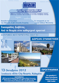 Το Δ.Σ. της Ελληνικής Διαβητολογικής Εταιρείας διοργανώνει από έτους πρόγραμμα εκπαιδευτικών σεμιναρίων, τα οποία απευθύνονται σε γιατρούς που έχουν την επιθυμία να ασχοληθούν ιδιαίτερα με την αντιμετώπιση των ατόμων με Διαβήτη. Ένα τέτοιο σεμινάριο θα λάβει χώρα στις 13 Οκτωβρίου 2012, στην όμορφη Καλαμάτα, σε συνεργασία με τον Ιατρικό Σύλλογο Μεσσηνίας. στο Ξενοδοχείο Elite City Resort.