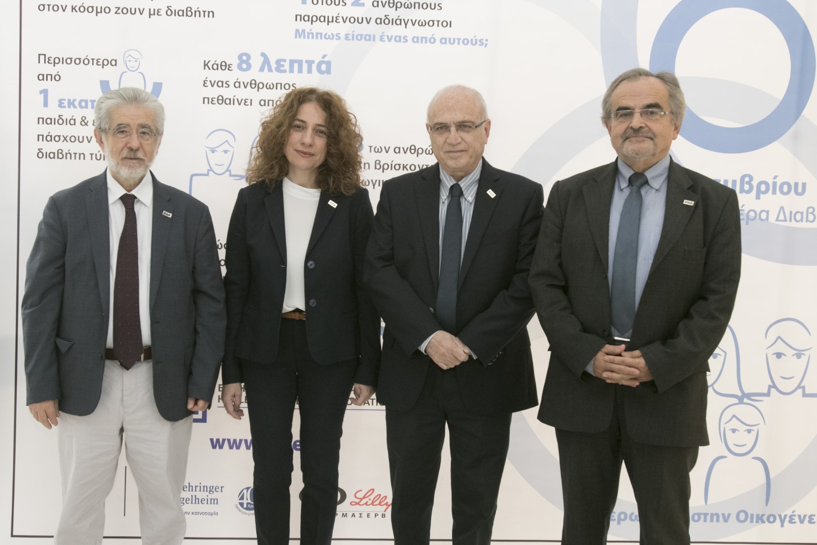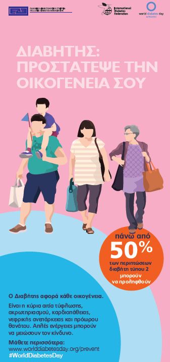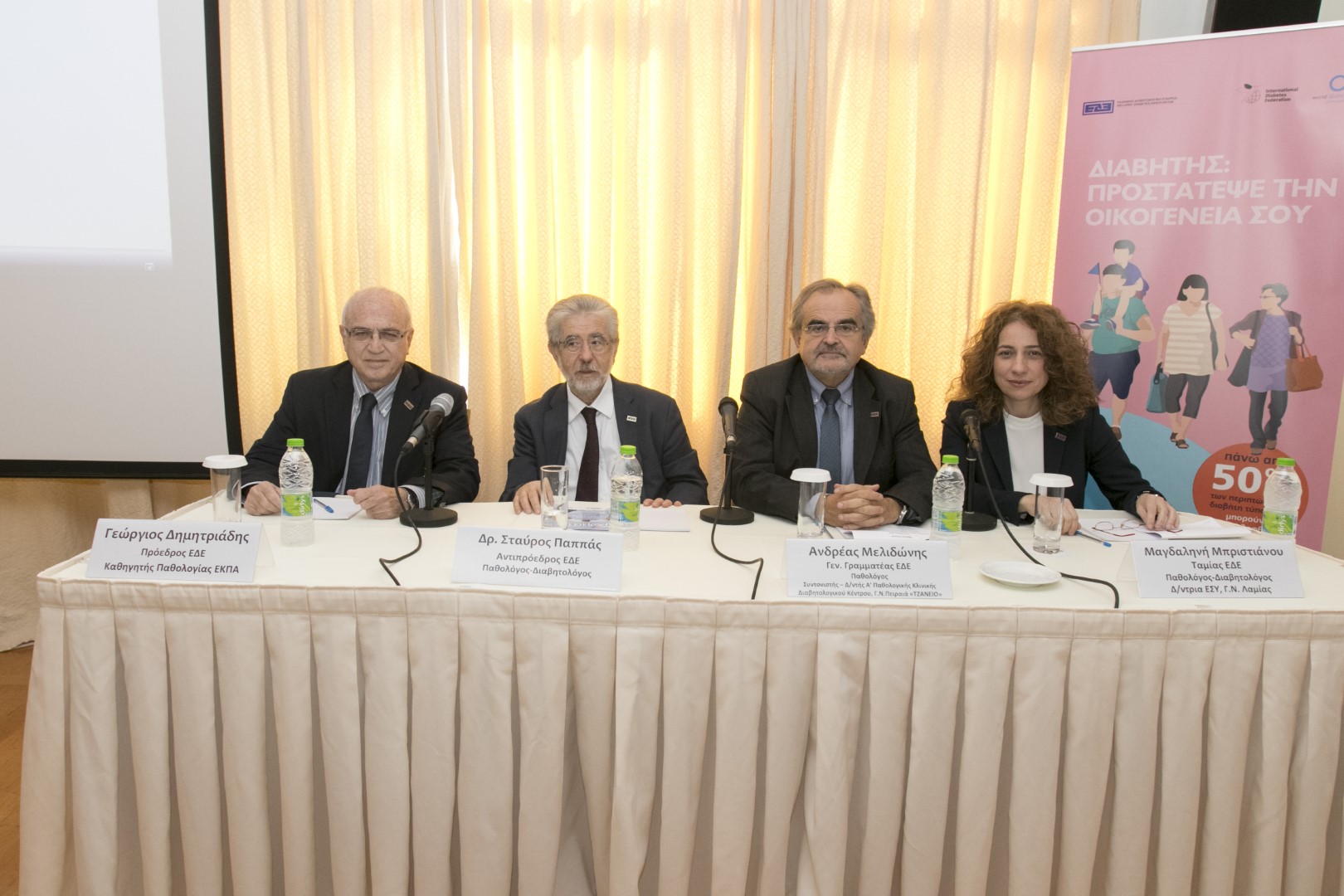 Ο Γεώργιος Δημητριάδης, Πρόεδρος της ΕΔΕ, Καθηγητής Παθολογίας ΕΚΠΑ, αναφερόμενος στην καμπάνια ενημέρωσης τόνισε ότι για 2η χρονιά η Παγκόσμια Ημέρα Διαβήτη είναι αφιερωμένη στην Οικογένεια, τον πυρήνα, ο οποίος εξασφαλίζει σταθερότητα στον κοινωνικό ιστό και συνοψίζεται σε τρεις πυλώνες: Ανακάλυψη, Πρόληψη και Διαχείριση του ΣΔ. «Δυνητικά, o ΣΔ αφορά όλες τις οικογένειες και επομένως η καλή γνώση των συμπτωμάτων και των παραγόντων κινδύνου όλων των τύπων ΣΔ είναι ζωτικής σημασίας για την έγκαιρη διάγνωση και την πρόληψη του. Το 80% των περιπτώσεων ΣΔ τύπου 2 (ΣΔτ2) μπορεί να προληφθεί με την υιοθέτηση ενός υγιεινού τρόπου ζωής, ενώ το 70% των πρώιμων θανάτων των ενηλίκων προκαλούνται από συνήθειες που υιοθετούνται κατά την περίοδο της εφηβείας, Τα τελευταία χρόνια παρατηρείται κατακόρυφη αύξηση της εμφάνισης παχυσαρκίας και ΣΔτ2 στα παιδιά και η ευθύνη βαρύνει αποκλειστικά τις οικογενειακές συνήθειες. Όταν η οικογένεια τρώει υγιεινά γεύματα και ασκείται, όλα τα μέλη της υιοθετούν και ενισχύουν συμπεριφορές, οι οποίες επιτρέπουν την πρόληψη του ΣΔτ2 ή την ευκολότερη διαχείριση του ΣΔ τύπου 1 (ΣΔτ1) όταν αυτός εμφανισθεί. Η μείωση της εμφάνισης του ΣΔ ξεκινά επομένως από το σπίτι και η οικογενειακή υποστήριξη είναι απαραίτητη προϋπόθεση για την πρόληψη, πρώιμη εντόπιση, εκπαίδευση, ψυχική-συναισθηματική στήριξη, φροντίδα και διαχείριση του ΣΔ».