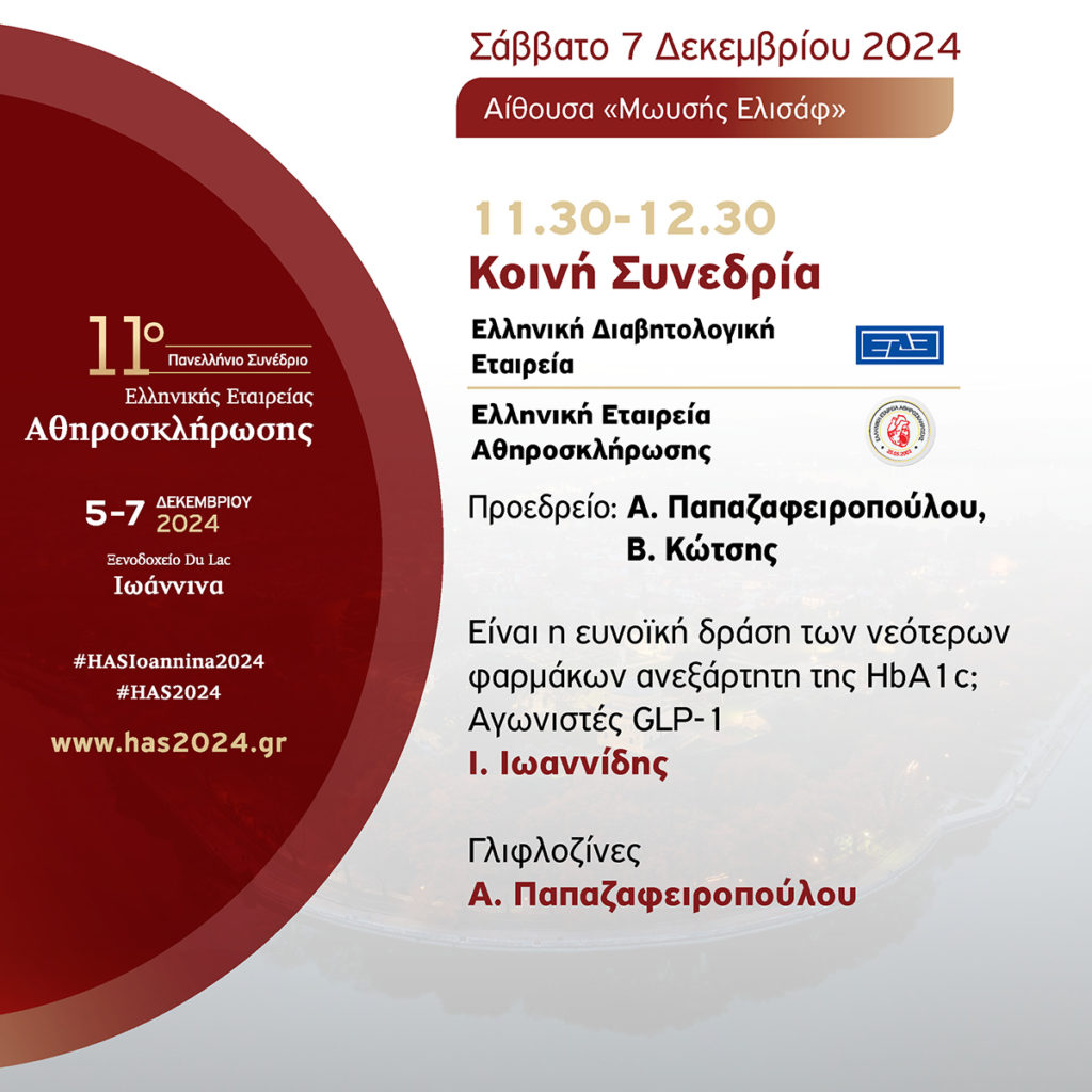 Με το παρόν email, θα θέλαμε να σας ευχαριστήσουμε θερμά για τη συμμετοχή της Ελληνικής Διαβητολογικής Εταιρείας στο 11ο Πανελλήνιο Συνέδριο της Ελληνικής Εταιρείας Αθηροσκλήρωσης, που θα πραγματοποιηθεί στις 5 – 7 Δεκεμβρίου 2024, στο Ξενοδοχείο DuLac στα Ιωάννινα.