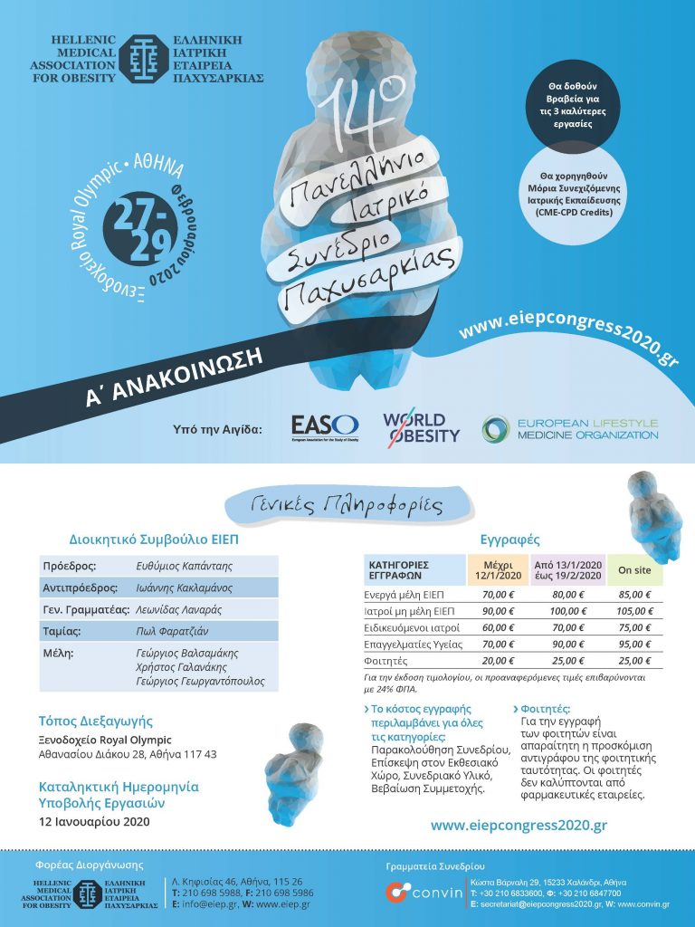 Με ιδιαίτερη τιμή και χαρά, η Ελληνική Ιατρική Εταιρεία Παχυσαρκίας, σας προσκαλεί στο 14ο Πανελλήνιο Ιατρικό Συνέδριο Παχυσαρκίας που θα πραγματοποιηθεί 27 – 29 Φεβρουαρίου 2020 στο ξενοδοχείο Royal Olympic.
