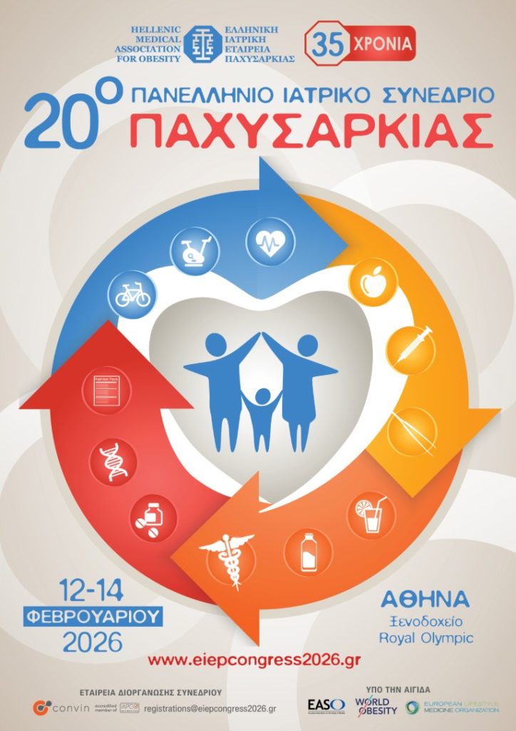 Η Ελληνική Ιατρική Εταιρεία Παχυσαρκίας διοργανώνει στις 12-14 Φεβρουαρίου 2026, «20o Πανελλήνιο Ιατρικό Συνέδριο Παχυσαρκίας» στο Ξενοδοχείο Royal Olympic στην Αθήνα, -ένα συνέδριο επετειακό και πολυδιάστατο, με επίκεντρο τις τελευταίες εξελίξεις στην πρόληψη, διάγνωση και κυρίως στην θεραπευτική αντιμετώπιση της παχυσαρκίας.