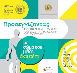 Με χαρά σας καλωσορίζουμε στην Ημερίδα που διοργανώνει η Ελληνική Ρευματολογική Εταιρεία & Επαγγελματική Ένωση Ρευματολόγων Ελλάδος (ΕΡΕ-ΕΠΕΡΕ) σε συνεργασία με την Εταιρεία Γενικής/ Οικογενειακής Ιατρικής Ελλάδος «Ιπποκράτης» με θέμα: «Προσεγγίζοντας τους ασθενείς με ρευματικές παθήσεις στην Πρωτοβάθμια Φροντίδα Υγείας (Π.Φ.Υ.)».