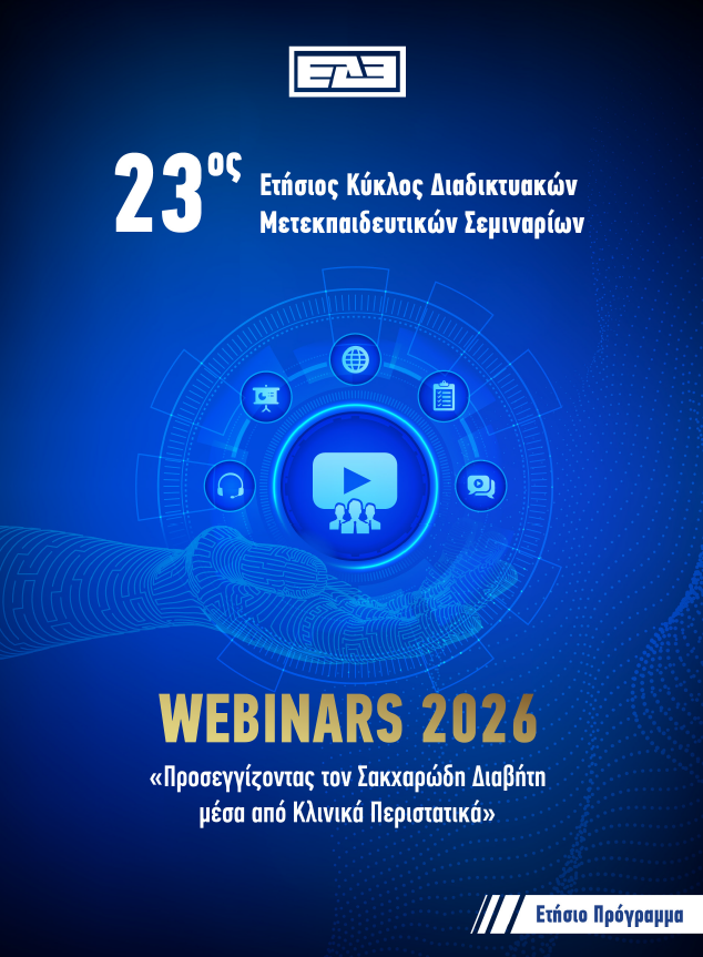 Συνεχίζοντας την παράδοση της διαδραστικής τηλεκπαίδευσης, η ΕΔΕ διοργανώνει τον 23ο Ετήσιο Κύκλο Διαδικτυακών Μετεκπαιδευτικών Σεμιναρίων (Webinars) της Εταιρείας, έτους 2026, με θεματικό κύκλο: “Προσεγγίζοντας τον σακχαρώδη διαβήτη μέσα από κλινικά περιστατικά“, δίνοντας έμφαση στη στρατηγική διαχείρισης, στην ολοκληρωμένη αντιμετώπιση και στην ορθή καθημερινή κλινική πρακτική. Η θεματολογία των Webinars 2026 διαμορφώθηκε από την Ομάδα Εργασίας Webinars της Επιτροπής Εκπαίδευσης και το Διοικητικό Συμβούλιο της ΕΔΕ.